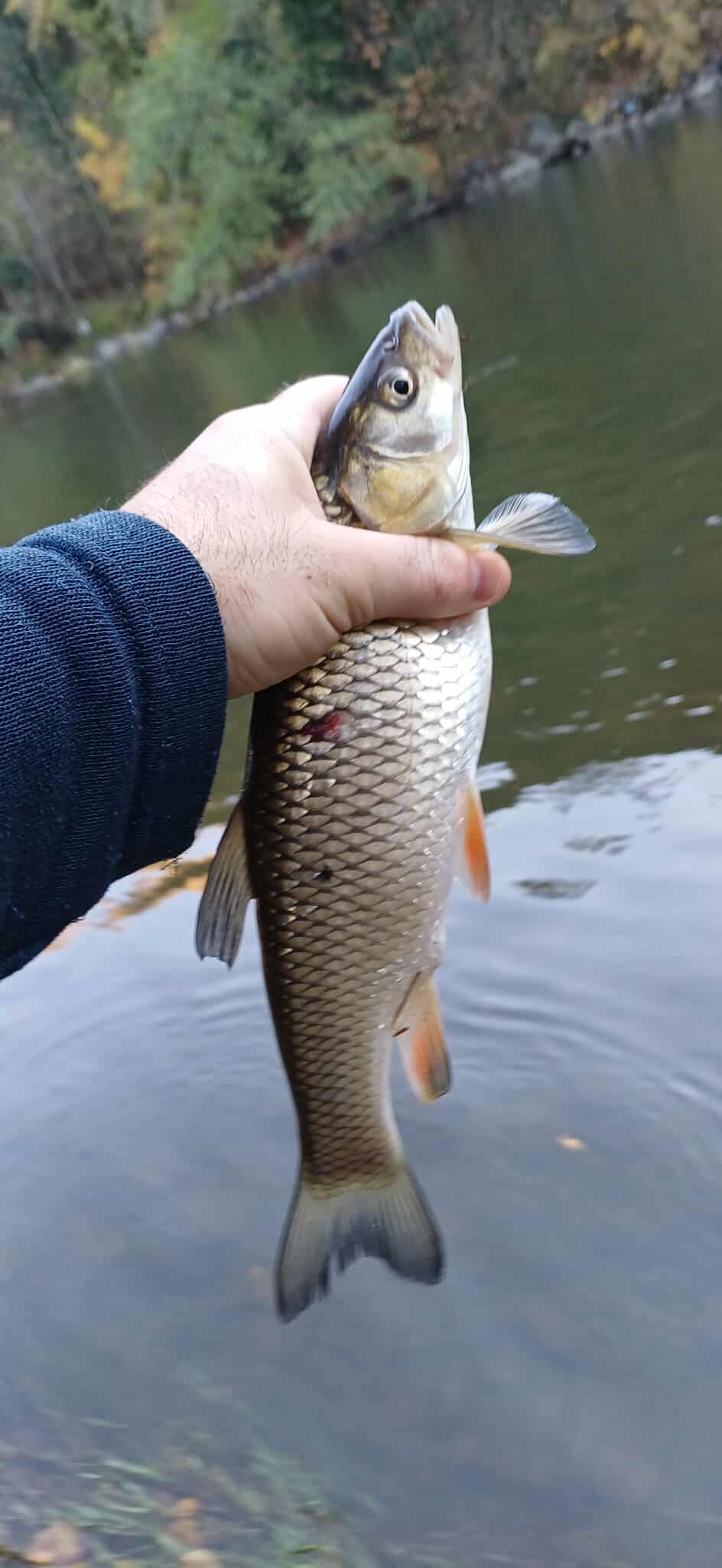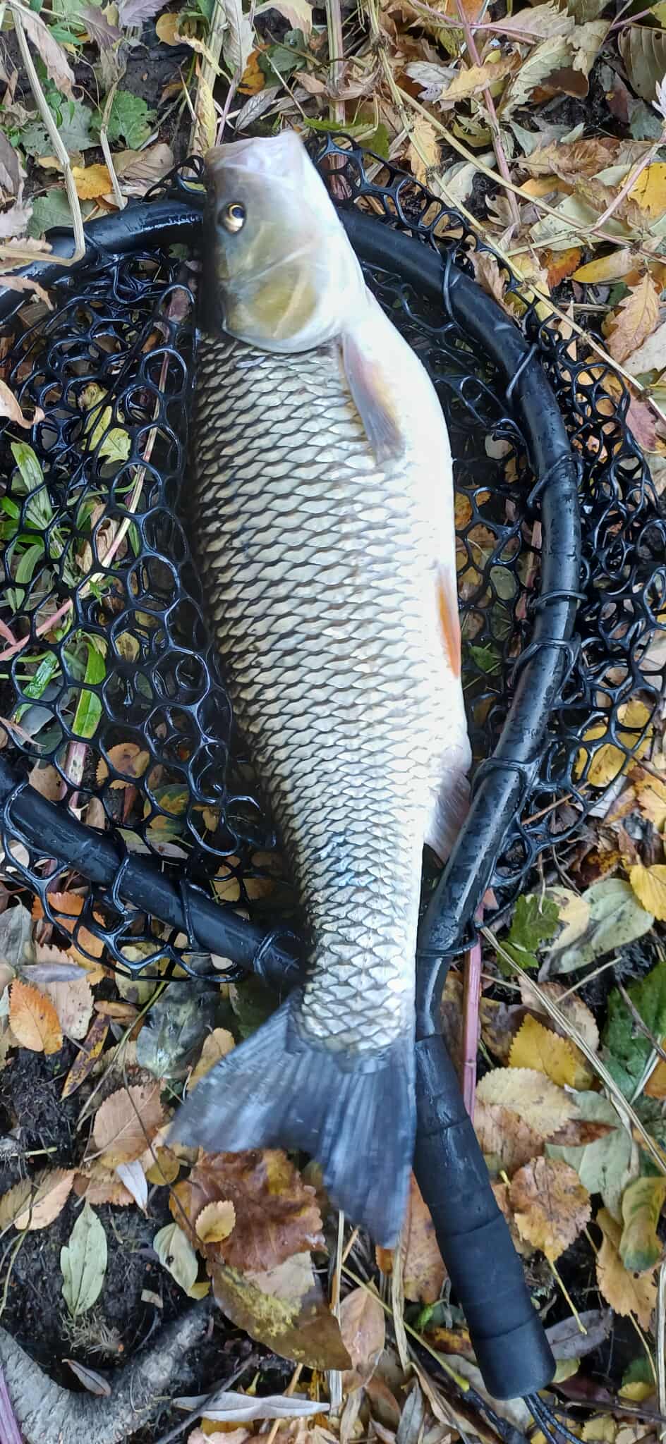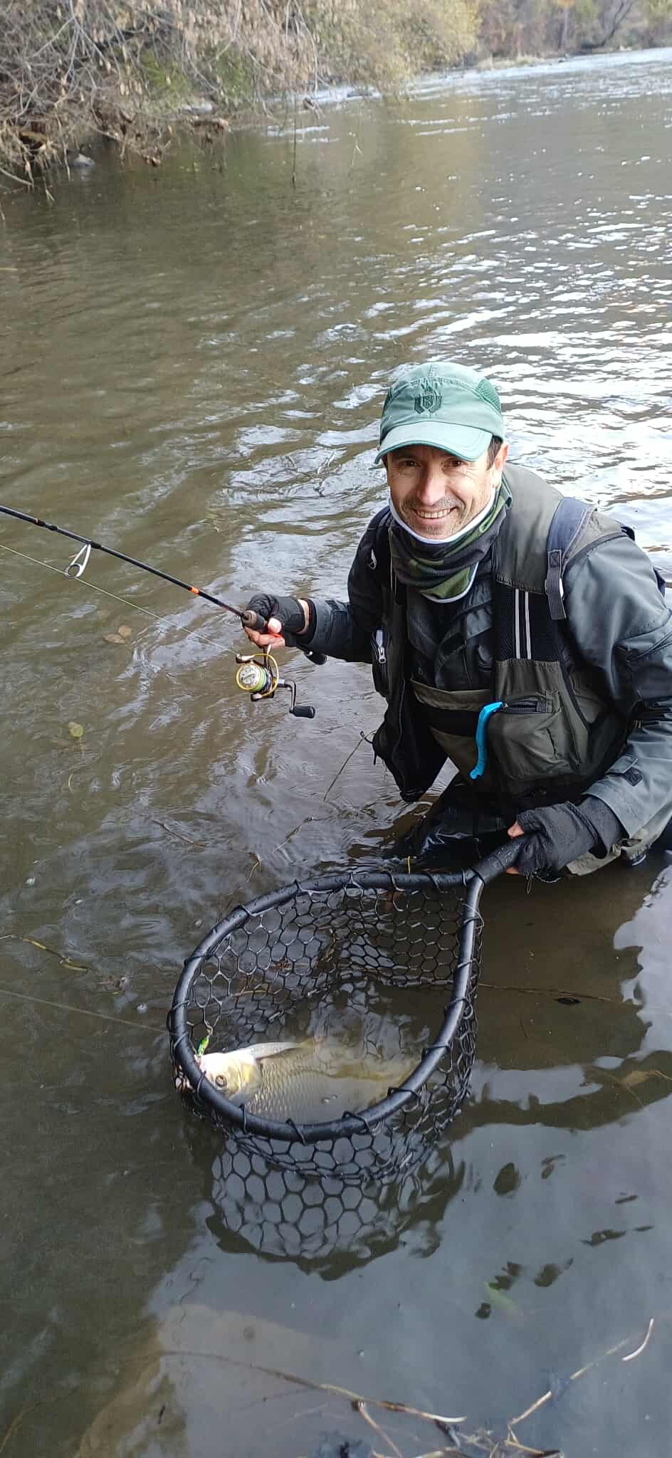 Водата бърза, на вълни и в завой. До средата има някакво затишие и след това става доста по-бърза. За капак, пред нас треви. Абе по-скоро лятно място, ама сме тръгнали да настояваме. Аз си харесвам да нагазя под едно паднало дърво, за да имам максимален коридор за изтегляне в по-тихото пред тревите. Илко слиза 30м отдолу, стреля навътре и ветрило в бързака. Няколко хвърляния и като го взе … поглеждам, въдицата му се сгънала до дръжката. Набързо дотичах нагазих при него и само можеше да се кефя на момента. Не беше лесно в тревите, но Илко с уверени действия накрая успя да вкара рибока в новия кеп за „трофейни кефали“. И като виждаме рибата …. „амурче“, ама над 2,5кг, ама много дебело, аха кат шаранче Закачило се на задната единична кука на CC-38. Набързо го изнесохме на едни тревички, дори не го вадихме от кепа, седя полегнал на мрежата, а ролетката закова на 57см. Личен рекорд на майстора и една от много редките. Имах в живота си две подобни риби, време беше и Илко да го споходи щастието.