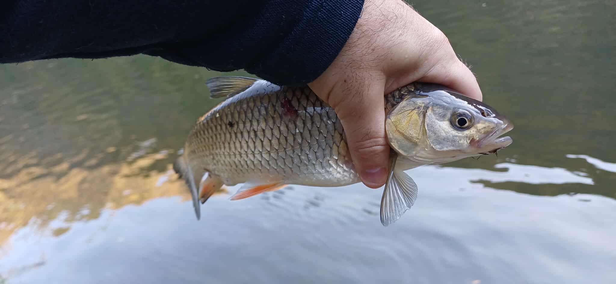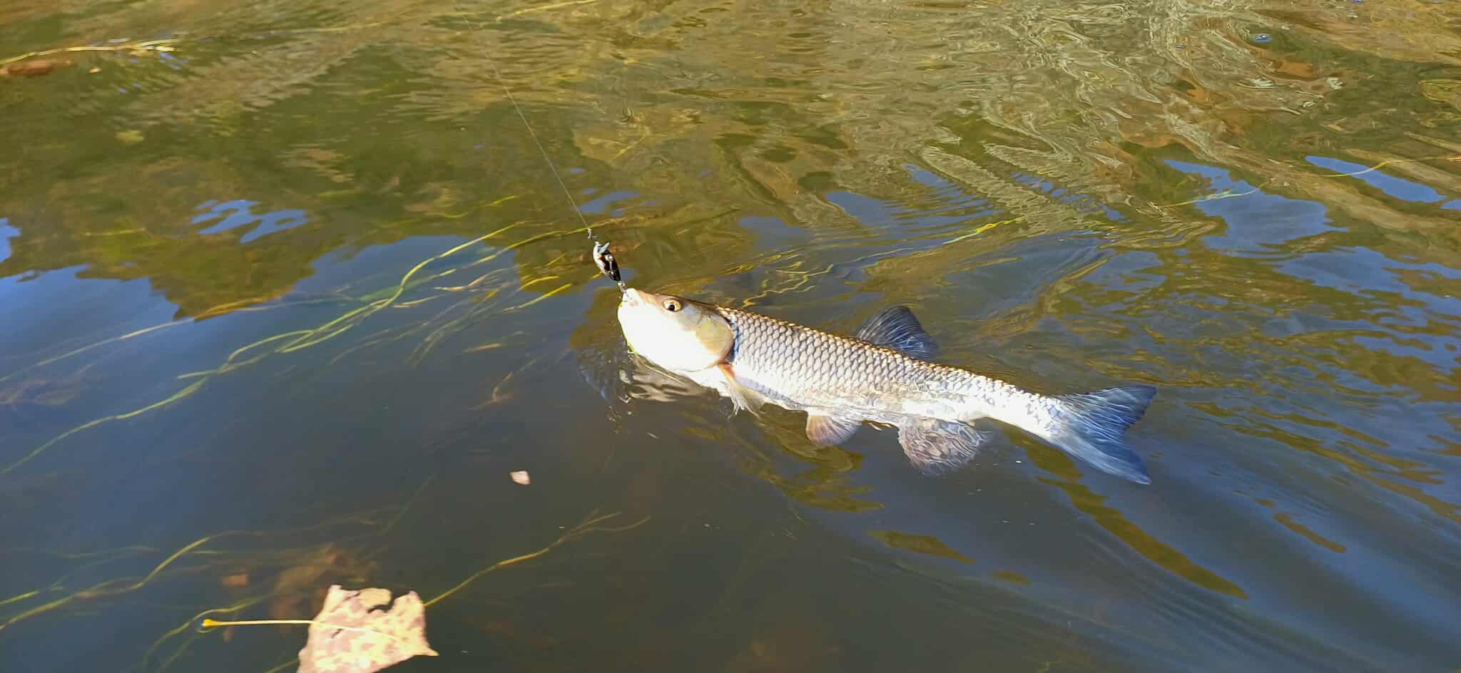 След това Илко ме поведе на друг вир. Там с изненада установихме, че има групирани риби и още на първото подаване на една много стара жаба на Vidra ме взе спортен кефал. После последваха още няколко удара, Илко също се разписа, обаче усещахме, че въпреки това рибите са доста пасивни. Закачаха се на края на устата на задната кука и вземаха едва, едва…. Пробвах за малко на силикон след известно затишие при мен и почти веднага залових още един спортен кефал около 30см. После пак обърнах на воблери. След 7-8 реализирани или не кълванета на този вир, тръгнахме пак надолу. Там Илко ме помъкна на истински каньонинг, с катерене,стръмно спускане, газене поне 100м, за да достигнем два любими негови вира… времето стремглаво напредваше и нямаше за къде да се мотаем. Чопленето и на тези вирове даде резултат и още 5-6 риби проявиха интерес, като част от тях и извадихме. Поглеждам часовника 12 и 12, още едно замятане и обратно.
